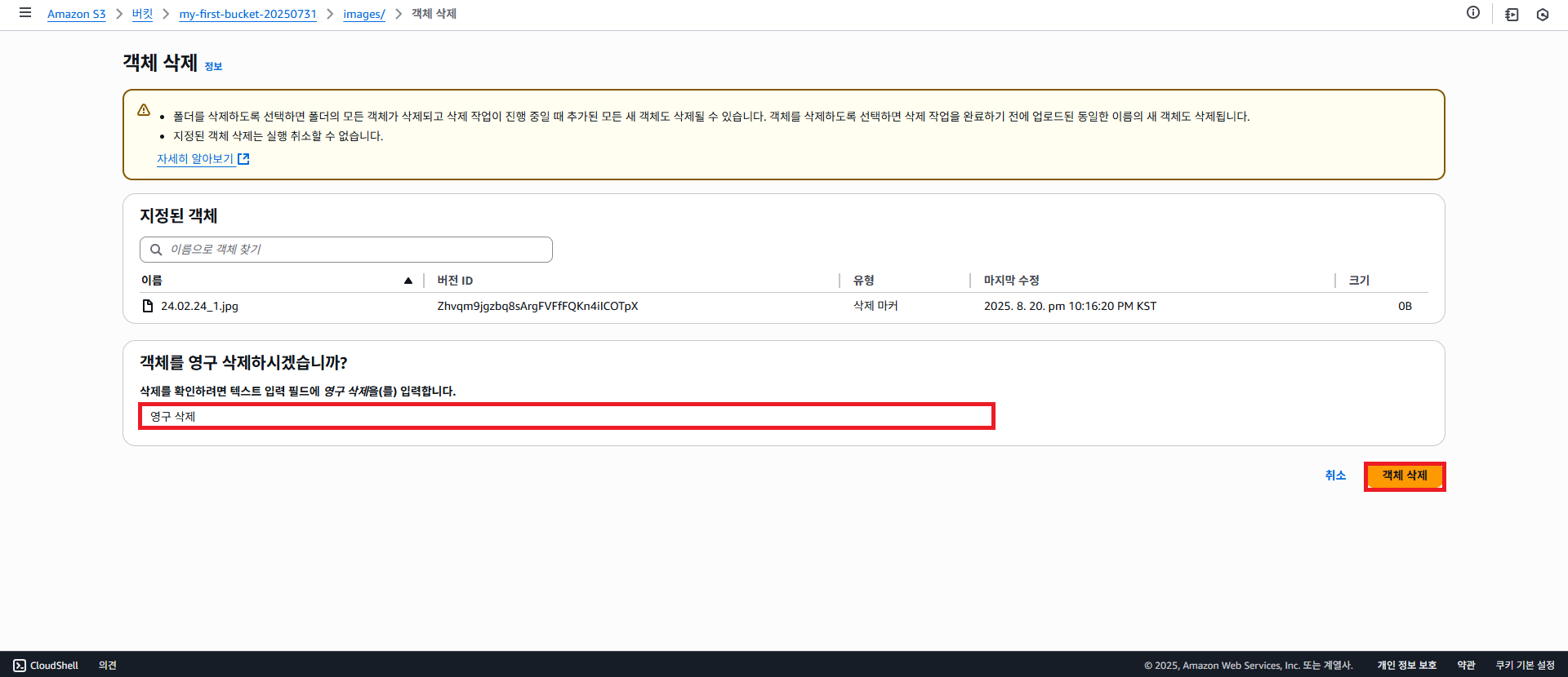 "영구 삭제"를 입력하고 "객체 삭제" 버튼을 클릭하여 해당 버전 ID의 객체를 삭제합니다.