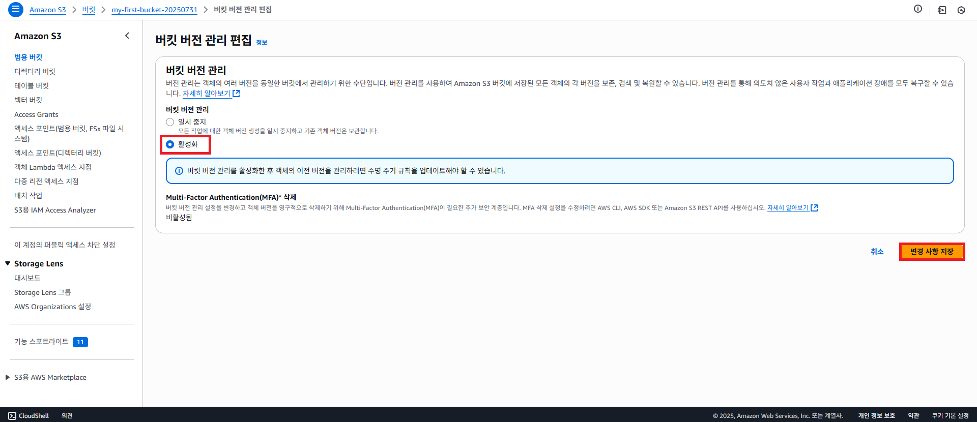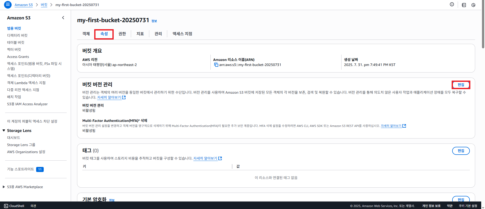 S3 버킷에서 "속성"탭으로 이동하여 "버킷 버전 관리"의 "편집"을 클릭합니다.