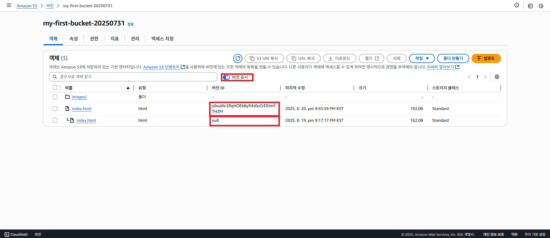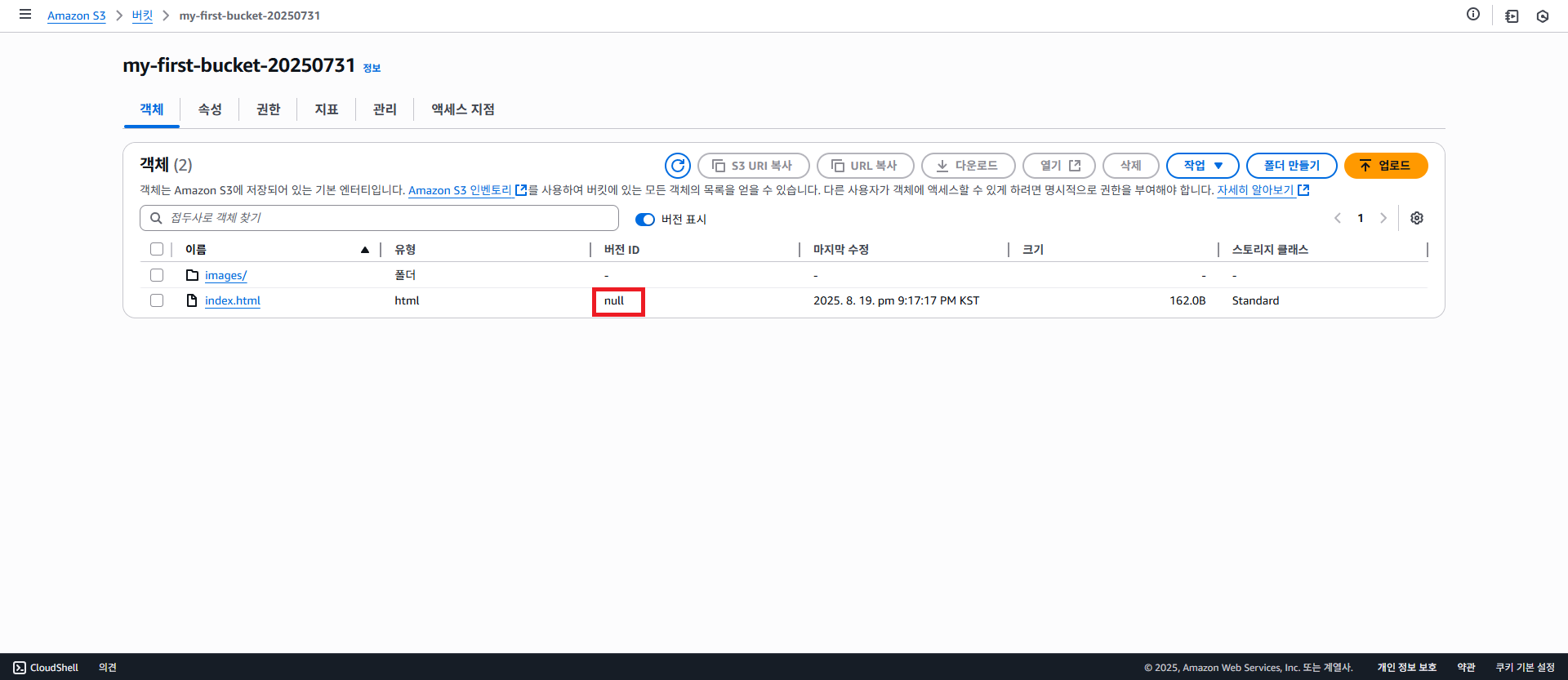 S3 버킷으로 돌아오면 "버전 ID"가 "null"인 "index.html"하나만 존재하고 있습니다.
